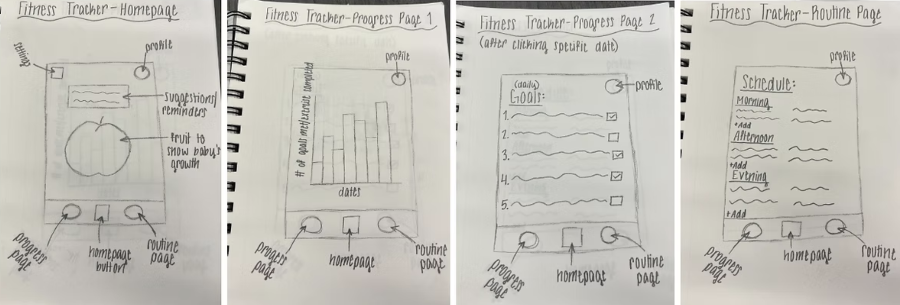After aggregating the desired features, we designed low-fidelity mockups of each page and their features.