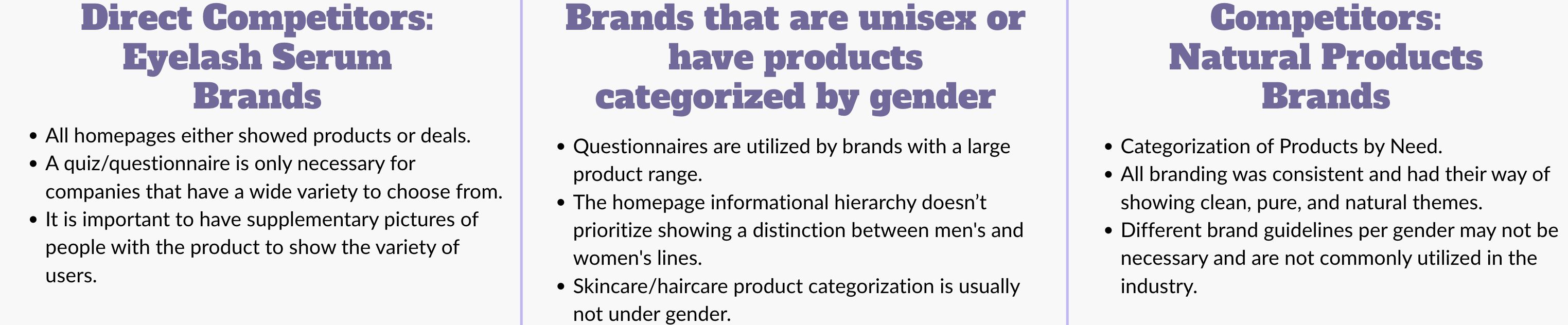 We interviewed six users to better understand customer thought and decision processes when using/purchasing skincare and/or eyelash serums. We asked questions surrounding users’ skincare and concerns, as well as the method by which they found their preferred brand.